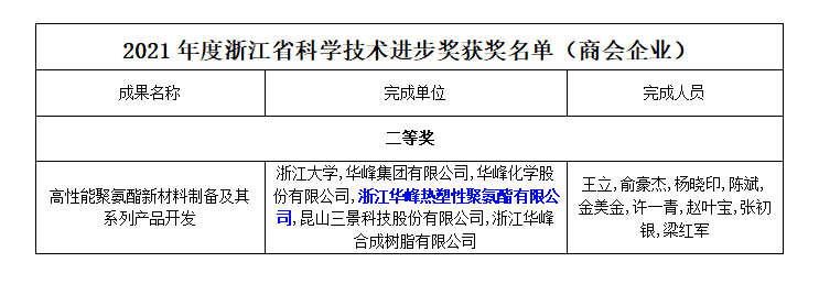 热烈祝贺浙江华峰热塑性聚氨酯有限公司的项目荣获2021年度浙江省科学技术奖!